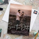 Dieses moderne Drehbuch Save the Date mit einer Platzhalterkarte für ein Foto ist ideal für Paare, die eine moderne Ästhetik Liebe. Die Vorderseite wird mit den Worten "Save the Date" in einem handgeschriebenen Schriftart der Unterschrift versehen. Die Hintergrundfarbe kann in jede gewünschte Farbe geändert werden.