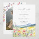 The back features a modern boho arch photo template framed by delicate wildflower accents, allowing you to showcase a favorite engagement picture with bohemian flair. This blend of scenic landscape art and personalized photography creates a stunning first impression for your guests. Whether you are marrying in a national park or a local garden, this nature-inspired card sets a romantic, organic tone for your upcoming wedding day.
