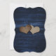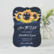 Rustic navy blue and sunflower wedding save the date card featuring sunflowers on a rustic wood background adorned with string lights. Two burlap hearts at the back. Matching items available.