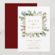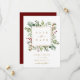 Cette carte plate de sauvegarde de date de mariage comporte de l'eucalyptus aquarellé peint, des feuilles vertes, des baies rouges, des branches de pin et un cadre carré doré faux avec un fond rouge au dos. Pour une personnalisation plus avancée de ce design, veuillez cliquer sur le lien "Personnaliser davantage". Des articles assortis sont également disponibles.