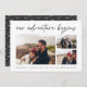 Moderne et passionnant, enregistrez la carte de date pour le couple aventurier, ce design épuré et simple comprend trois photos horizontales ou orientées paysage dans une mise en page de collage grille, avec "notre aventure commence" ci-dessus en écriture manuscrite. Personnalisez avec vos faire-part, noms et détails supplémentaires le long du bas, et ajoutez plus (comme votre site Web mariage) à l'arrière.