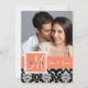 Elégante Orange Peach Coral Rose couleur accent avec Monogramme blanc avec motif Vintage noir et blanc Damask Enregistrer la date Cartes plates avec votre photo Fiançailles. Design de disposition par Elke Clarke©. Carte graphique sous licence. Customisez en insérant votre photo fiançailles, vos renseignements personnels et enregistrez le message de date au verso. Personnalisable . Cliquez simplement sur le bouton "PERSONNALISER".
