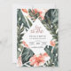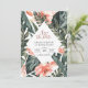 Palme tropicale Sauvegardez la carte de date pour votre mariage d'été à la plage décoré de feuilles de palmiers, roses de pêche et texte manuscrit.