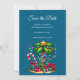 Enregistrez la carte de date avec une image de vacances saisonnière. Un palmier tropical orné de lumières festives surmonté d'une étoile. Un sucre de canne géant rouge et blanc qui sort du sable. Cadeaux de Noël sous l'arbre. Whimsical et amusant.
