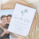 Ce simple mariage tropical simple, sauf la carte datant, est composé de deux palmiers en haut, avec un texte classique et élégant, dans une palette de couleurs blanc et bleu aqua/turquoise, avec un modèle photo à l'arrière.