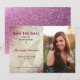 Annoncez votre grand jour avec élégance et éclat en utilisant cette carte de sauvegarde Quinceañera. Le côté gauche présente un papillon doré scintillant sur un fond rose blush et à effet pailleté avec une calligraphie moderne en bordeaux et noir. Le côté droit comprend une photo personnelle de la fille qui fête son anniversaire, ajoutant une touche sincère et élégante. Entièrement personnalisable avec votre nom, date et détails, ce design est parfait pour une célébration des 15 ans de rêve, glamour et mémorable.