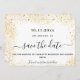 Un moderne et élégant Save the Date pour un mariage. Arrière - plan blanc décoré de parties scintillant faux or. brille. Personnalisez et ajoutez une date et des noms. Le texte : Save the Date est écrit avec un grand script de style à la main tendance.