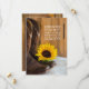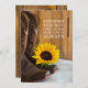 Donnez le ton pour votre cérémonie de mariage décontractée mais classe avec le charme Country Sunflower Western Wedding Save the Date Annonces. Ce charmant mariage à thème de ranch personnalisé garde le faire-part date dispose d'une photo florale pittoresque de bottes de cowboys en cuir marron, fleurs de tournesol jaune et bois de grange sur satin blanc. Idéal pour une fête de mariage à la ferme et un événement de réception.