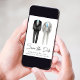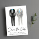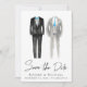 Élégante et chic annonce de mariage gay sans photo avec deux aquarelles de smoking gris et noir avec des accents bleus et "Save the Date" dans un script stylisé. Ajoutez vos noms, date et lieu de mariage dans une typographie moderne.