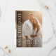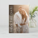 Carte de sauvegarde de date de mariage avec votre photo et texte blanc "Sauver la date" dans une police élégante alignée verticalement à gauche. Photo supplémentaire et message personnalisé au verso.
