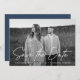 Enregistrez simplement la carte de date avec votre photo horizontale de fiançailles avec "Enregistrer la date" dans une superposition manuscrite blanche. Personnalisez le moderne enregistrer la carte de date en ajoutant vos noms, date mariage et emplacement du mariage. La photo enregistrer la date inverse pour afficher votre site Web mariage et d'autres détails en lettres blanches avec un arrière - plan bleu marine.