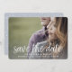 Une carte de datation moderne conçue pour accommoder votre photo de fiançailles à fond à orientation horizontale ou paysagère préférée. "Enregistrer la date" apparaît comme une superposition le long du bas en blanc écriture de script de style manuscrit, avec vos noms, date mariage et emplacement du mariage sous. Les cartes renversent vers un motif confetti pointillé subtil en gris et blanc.
