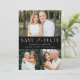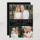 Élégant, multi-photo enregistrer la date avec "Enregistrer la date" affichée en lettres blanches avec un arrière - plan noir. Personnalisez le QR moderne enregistrez la carte de date avec 3 de vos photos préférées, vos noms, date mariage et emplacement du mariage. Le noir et blanc enregistrer la date inverse pour afficher votre code QR personnalisé avec le site Web mariage et le texte personnalisé.