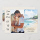 Mariage à thème plage enregistrer l'invitation de date avec 4 photos personnalisées. Des éléments design avec une scène aquarelle d'un magnifique océan bleu qui lèche le sable d'une plage bordée de palmiers sous le ciel d'été. Lettres modernes avec écriture décontractée, manuscrite. Parfait pour un mariage sur la plage, mariage côtier, mariage d'été, mariage de mer, mariage nautique, mariage de croisière sur l'île des caraïbes tropicales ou tout mariage de destination balnéaire. Des invitations de coordination, de la papeterie, des panneaux et de la décoration du jour de l'événement sont disponibles dans ma collection de mariages estivaux de plage, mais s'il vous plaît, envoyez-moi un message si vous avez besoin que j'ajoute d'autres articles.