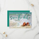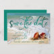 Envoyer les annonces non-photo ENREGISTRER LA DATE pour une destination tropicale ou de plage ou mariage thématique avec cette carte de photographie de plage avec deux coquillages de conches et des vagues de l'océan. Police script moderne dans des couleurs turquoises turquoise. ~photo par YTC ; tous droits réservés