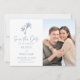 Cet élégant mariage tropical bleu poussiéreux à la plage, à l'exception de la carte datation, présente deux palmiers au-dessus du texte, un script d'écriture élégante pour le faire-part "Save the Date", et une photo du couple heureux.