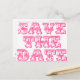 Herrlicher Vintager Schriftart in Rosa mit der Meldung "Save the Date" füllen Sie den ganzen Platz auf der Vorderseite der Karte. Stilvolles und originelles Design, würde ein traditionelles Thema und ein modernes, eigenartiges Design Anzug. Andere Farben in meinem Shop unter der Rubrik "Slogan".