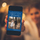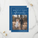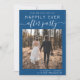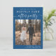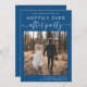 Moderne classique bleu enregistrer la date annonce pour votre salon ou réception de mariage privé qui présente votre photo et "Happily Ever After Party" dans un mélange de simple typographie blanche et un script blanc chic avec des swashes. Sous votre photo, ajoutez vos prénoms et la date et l'emplacement de la réception/fête.