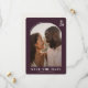 This elegant save the date design features a warm, romantic photo framed within an arched border, set against a rich maroon background. The typography is clean and modern, complementing the soft, natural tones of the image. Perfect for couples looking to announce their special day with sophistication and charm, this design captures a timeless and heartfelt mood. It’s ideal for those who want to convey warmth and intimacy in their wedding announcement while allowing space for personalization details.