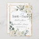 Magnifiques roses blanches élégantes et petites marguerites entourées d'un cadre en or rustique et de verdure mélangée d'eucalyptus avec d'autres feuilles aquarelles pour invitation de mariage. Un fond blanc propre ajoute à l'élégance de ce beau design. Époustouflant. Des éclaboussures d'or faux sur le devant et le dos pour créer un look chic.