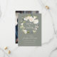 Envoyez-nous de belles cartes de dattes avec une délicate couronne de fleurs d'aquarelle blanche de roses, d'hydrangées, de fleurs mixtes et de verdure sur un arrière - plan vert sauge populaire. Un visage de type script écrit à la main moderne épelle magnifiquement les noms de la mariée et du marié. Le dos de la carte a un modèle photo pour télécharger votre photo désirée.