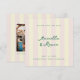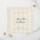 Envoyez des cartes de save the date modernes et dans l'air du temps avec des vibrations de l'Italie côtière et des rayures verticales de style cabana jaune beurre et rose coquillage pâle. Ce texte vert foncé élégant et chic est facile à personnaliser avec les détails de base du futur mariage comme les noms des mariés, la date du mariage, le lieu et le site web du mariage, ainsi qu'une photo d'enfacement carrée simple. Cela mélange une typographie sans empattement moderne avec un script de style manuscrit pour une ambiance élégante mais toujours décontractée, tandis que la forme carrée donne une impression unique et haut de gamme.