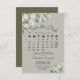 Cette belle carte de date permettra à vos amis et à votre famille de connaître votre prochain mariage. Il dispose d'un design chic boho élégant avec un calendrier personnalisable de votre mois mariage avec un coeur autour de votre journée spéciale, entouré de feuilles eucalyptus et verdure sur un arrière - plan sage ou vert olive clair. Il y a de l'espace pour vos noms, la date et l'emplacement du mariage. L'arrière est orné d'un bouquet rustique de feuillage noué avec un ruban blanc et un arc.