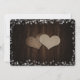 Mariage rustique enregistrez la carte de date avec un pot en maçon avec des lampes à cordes et orné de deux coeurs de burlap sur un arrière - plan en bois de grange. Personnalisez facilement ce mariage rustique romantique sauvez la date en ligne. Objets correspondants disponibles pour compléter ce mariage campagnard rustique enregistrer la date.