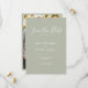 Cette carte Mariage Enregistrer la Date Invitation présente un design typographique élégant, moderne et minimal avec un jeu de couleurs vert sage. Prêt pour vous à customiser avec les détails de votre journée spéciale et ajouter votre propre photo au dos de la carte, s'il vous plaît naviguer dans la suite de Mariage minimal Sage Green Elegant pour les articles de papeterie correspondants.