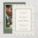 The soothing sage green and off white color scheme evokes tranquility and natural elegance, making it ideal for various wedding themes, from cottage garden ceremonies to elegant ballroom affairs. A vintage-inspired script font adds a personal and intimate touch to your announcement, beautifully complementing the rose design and ensuring your wedding details are presented with clarity and style. On the reverse side you'll find a photo template in a frame design to showcase your favorite photo, as well as ample space to add your wedding website information.
