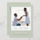 Donnez le ton pour votre jour de mariage avec cette carte de date élégante et moderne, conçue pour équilibrer simplicité et chaleur. L'avant présente votre photo personnalisée encadrée en blanc, superposée sur un arrière - plan vert sage et doux pour une sensation romantique et contemporaine. Personnalisez-le avec vos noms, votre date de mariage et votre emplacement pour en faire votre propre. Le dos reflète la même toile de fond verte sage, créant un look cohésif tout en offrant de l'espace pour le texte personnalisable, parfait pour partager des détails supplémentaires avec vos invités. Un beau mélange de tons terre, de style et de touche personnelle.