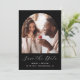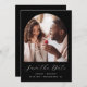 Cette simple et minimaliste carte Save the Date présente une arche photo boho au-dessus des mots "Save the Date" dans un élégant script d'écriture manuscrite blanche, suivi des noms du couple, date mariage et ville en sans serif police sur un arrière - plan noir. Ajoutez un message plus détaillé avec des informations supplémentaires sur l'inverse, ainsi qu'un code QR qui envoie les invités à votre site Web mariage.