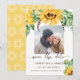 Carte de faire-part de mariage rustique unique en son genre avec un beau bouquet de tournesols le long du haut et un petit bouquet en bas à droite, votre photo préférée, typographie calligraphique moderne et script utilisée. Le dos de la carte est jaune uni avec un motif d'icône de tournesol blanc.