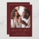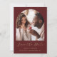 Cette simple et minimaliste carte Save the Date présente une arche photo boho au-dessus des mots "Save the Date" dans un élégant script d'écriture dorée, suivi des noms du couple, date mariage et ville en sans serif police sur un arrière - plan rouge bordeaux. Ajoutez un message plus détaillé avec des informations supplémentaires sur l'inverse.