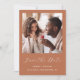 Cette simple et minimaliste carte Save the Date présente une photo carré au-dessus des mots "Save the Date" dans un élégant script d'écriture manuscrite blanche, suivie des noms du couple, date du mariage et ville en sans serif font sur un arrière - plan en terre cuite. Ajoutez une seconde photo horizontale et un message plus détaillé avec des informations supplémentaires sur l'inverse.