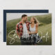 Avec une seule photo horizontale et un script moderne écrit "enregistrer la date", cette carte est la façon idéale d'annoncer votre fiançailles et le prochain mariage à vos amis et votre famille. Le texte blanc est audacieux et moderne mais toujours sophistiqué. Le texte personnalisable sur le devant a de la place pour les noms, la date, l'emplacement et d'autres informations comme un site Web mariage. Le dos est un bleu marine classique avec un mouchoir blanc étoilé. La couleur est modifiable en cliquant sur "Personnaliser".