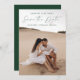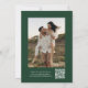 Annoncez votre prochain mariage dans le style avec ce code QR design Modern Script Green enregistrer la carte de date! Le design inclut "Save the Date" affiché dans la calligraphie verte tendance superpose avec votre photo fiançailles à fond, verticale. Personnalisez l'avant du minimaliste enregistrez la date avec vos noms, date du mariage et emplacement. Le verso de la carte affiche une image supplémentaire avec un code QR que les invités peuvent scanner pour visiter votre site mariage. Le vert chic sauve la date est le choix idéal pour les mariages modernes.