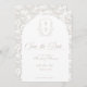 Pale Taupe Monogram Crest Wedding Enregistrer La Date : Art Vintage de ligne monographie crête avec élégante typographie taupe pâle. Dispose d'un motif floral de chinoiserie en forme d'arche et sur l'envers pour une sophistication intemporelle. Police de script élégante pour un style formel et classique.