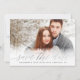 Cet élégant enregistrement de la date présente un script argenté brillant en faux papier avec un dossier rayé. Téléchargez votre propre photo et customisez les informations pour inclure les détails de votre mariage.