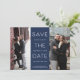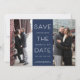 Moderne enregistrer la date carte photo caractéristiques sans serif et italique lettrage en blanc immaculé, avec vos noms, date mariage et emplacement entrecoupé par "enregistrer la date". Le texte est centré sur un arrière - plan bleu marine riche qui divise deux de vos photos préférées de fiançailles vertical ou portrait. Personnalisez avec vos informations d'invitation et/ou le site Web mariage le long du bas. Un choix chic de dates pour les couples modernes avec une esthétique minimaliste.