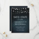 Complétez votre soirée de mariage étoilée avec ces mariage romantique et facile à personnaliser enregistrer les cartes de date avec des lumières à cordes sur un arrière - plan étoilé bleu foncé.
