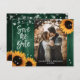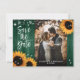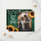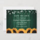 Photo de mariage vert rustique et tournesol enregistrer la carte de date avec tournesol et lampes à cordes sur un arrière - plan en bois de grange. Conception de carte idéale pour une fête champêtre, jardin, jardin ou grange vert inspirée des tournesols.