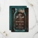 Mariage turquoise rustique enregistrez la carte de date avec un pot de mason et les coeurs de burlap contre un arrière - plan en bois de grange orné de lumières scintillantes. Personnalisez facilement ce mariage rustique romantique turquoise enregistrer la date en ligne. Objets correspondants disponibles pour compléter ce mariage turquoise enregistrer la carte de date.