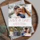Annoncez votre date mariage dans le style avec notre photo moderne enregistrer les cartes de date. L'avant de la conception comprend trois de vos photos fiançailles avec "Save the Date" affichées en caractères serif et script bordeaux modernes. Personnalisez l'avant de la photo multi enregistrer la carte de date en ajoutant vos noms, la date mariage et l'emplacement du mariage. L'élégant enregistrer la carte date inverse pour afficher un motif de treillis bordeaux et blanc.