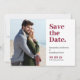 Cette moderne horizontale enregistrer la carte de date comporte une photo verticale. Le "Save the Date" apparaît dans le texte classique en gras bordeaux sur un arrière - plan blanc. Le backside propose du texte personnalisé pour votre site mariage.