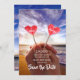 Personnaliser la flamme jumelle enregistrer la date avec le coeur mignon en forme. Lolipops contre une belle scène de plage avec les mots "J'ai demandé" et "J'ai dit oui"