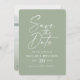 Simple Feuille verte avec Script Photo Wedding Enregistrer Les Cartes De Date. Ce design moderne mais classique est minimaliste et élégant avec une couleur simple et solide et de belle calligraphie signature texte. Montré dans la nouvelle colorway. Il comprend également une photo personnalisée en option sur le côté arrière. Ou simplement masquer le calque pour avoir un arrière - plan solide à la place. Pour en savoir plus, recherchez les collections mariages 2022 de Chic Paperie pour voir toutes les tendances design et couleurs mariages de cette année.