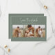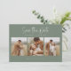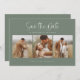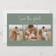 Green Simple Calligraphy Script Four Photo Save the Date présente un trio de photos sur le devant, ainsi qu'un type moderne et minimal. Une seule grande photo sur le dos, avec votre site mariage.
