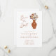 Whimsical Retro Boho Floral Wedding Enregistrer la Date... Un bouquet floral fantaisiste dans un style bohème rétro se trouve dans un vase en terre cuite recouvert de vos numéros de date mariages. Le design affiche vos détails Save the Date dans un script de calligraphie moderne ainsi que la typographie serif et sans serif élégante. Le verso de la carte inclut le code QR de votre site mariage afin que les invités puissent suivre votre voyage et aussi voir des informations importantes sur vos nouveautés. Tout le texte, sauf le script de calligraphie, peut être facilement révisé sur le modèle de personnalisation.