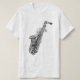 Ein cooler, ausführlicher Entwurf eines Saxophone auf einem weißen T - Shirt, mit Fingerabdrücken und addierten musikalischen Anmerkungen.